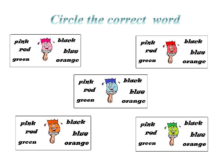Put the missed letters Wh. . te, b. . ack, r. . d, . ellow, gre. . n, bl. . e, or. . nge, pu. . ple, gr. . y, pin. . , bro. . n