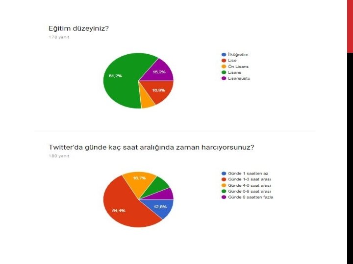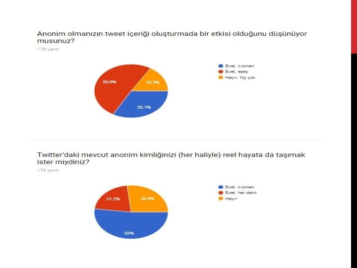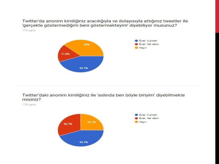 Evren ve Örneklem Araştırma çalışmasının evrenini, Twitter’da bulunan 17 yaş üstü ki, daha çok 17 – 32 yaş arası Türk gençlerini temsilen tüm anonim kullanıclar; örneklemi ise, araştırmacının kendi Twitter hesabındaki takipleştiği ve belirtilen yaş grubundaki tüm anonim hesaplardan oluşturmaktadır. Anket Formu Bu form araştırmacı tarafından kapalı uçlu olmak üzere 12 sorudan oluşmaktadır. 1. ve 2. sorularda katılımcıların yaş ve cinsiyetleri, 3. soruda hangi eğitim düzeyinde oldukları, 4. soruda ise Twitter’ı günlük kullanma süreleri sorulmaktadır. 5. ve 6. sorular anonim kimlik inşasına yönelik sorulardan oluşmaktadır. 7. soruda anonim kimliğin devamlılığına yönelik süreç bazlı bir sorudur. 8. ve 9. sorular ise anonim kimliğinin hem takipleşme hem de içerik oluşturmadaki etkisi ve yansımalarını belirlemek amaçlı oluşturulmuştur. 10 – 12. sorular da ise anonim kimlik sahibinin gerçek kimliği arasındaki farklılığı saptanmak istenmiştir.