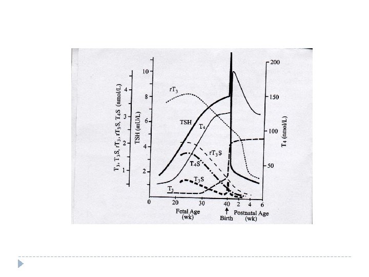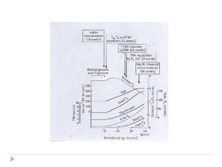 Postnatal dönemde tiroid fonksiyonları Doğumdan hemen sonra soğuk ve strese bağlı olarak �TSH ilk 30 dakikada 60 -80 m. IU/ml’e kadar yükselir � 1 -2 gün içinde giderek azalır, � 5 -7 gün içinde ortalama değerlerine iner (<8 m. IU/ml) �TSH’ın artmasının hemen ardından T 3 ve T 4 tirotoksik düzeye varacak kadar artar (İlk 24 saatte) �T 4 : 15 -19 g/dl, T 3 : 300 ng/dl �Bu olaya “fizyolojik hipertiroidism” denir