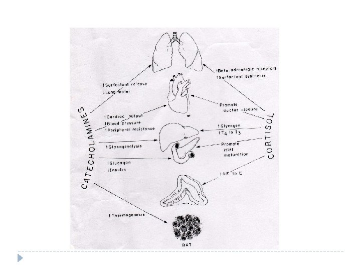 Kortizol deşarjının ikincil etkileri � Artmış T 3 düzeyleri � ß-adrenergic receptor bağlanmasını uyarır ve akc de surfaktan sentezini arttırır, � Kahverengi yağ dokusunun NE duyarlılığını arttırır