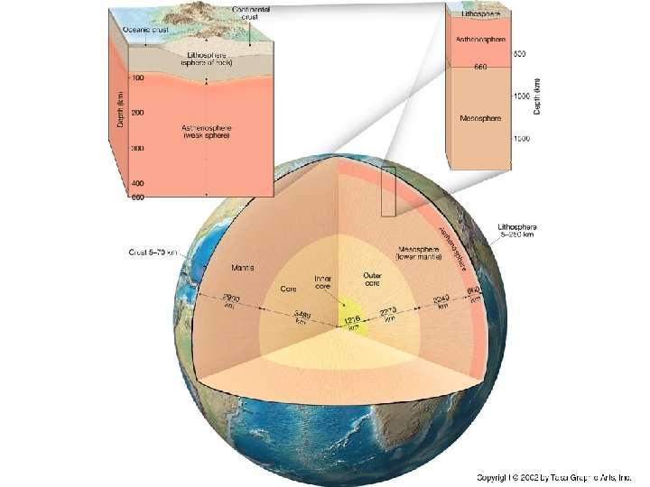 derinlik (km) Kabuk Yer içi Üst manto Geçiş Manto: Manto Peridotit (ultramafik) Üst Manto (0 -410)Upper to 410 km (olivin ® spinel) bileşimli u Düşük hız bölümü 60 -220 km Geçiş zonu hızlı bir şekilde artar Zonu 60 220 410 660 Alt manto 2898 DIŞ ÇEKİRDEK sıvı ÇEKİRDEK Alt Manto Dereceli bir şekilde hız artışı 5145 İç Çekirdek Katı 6370