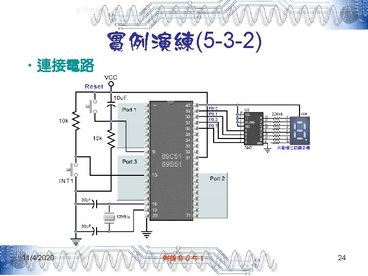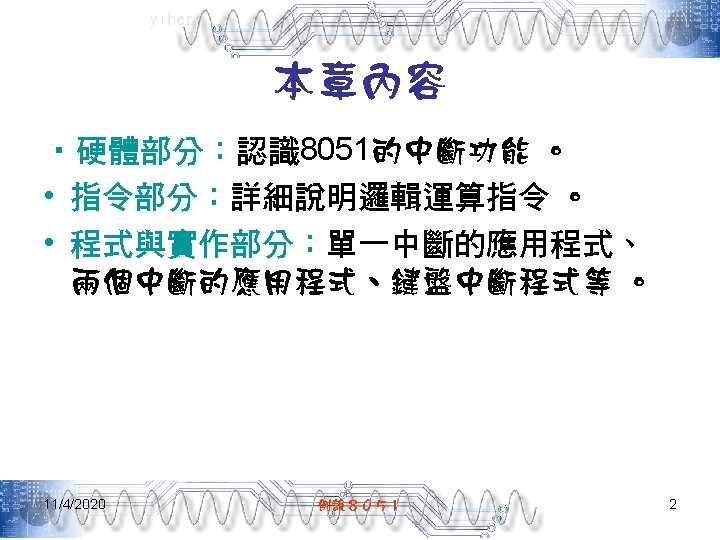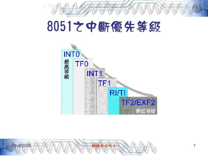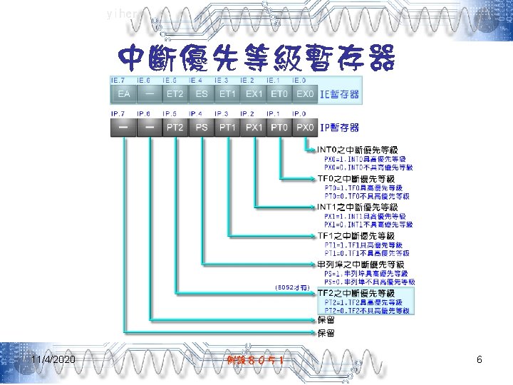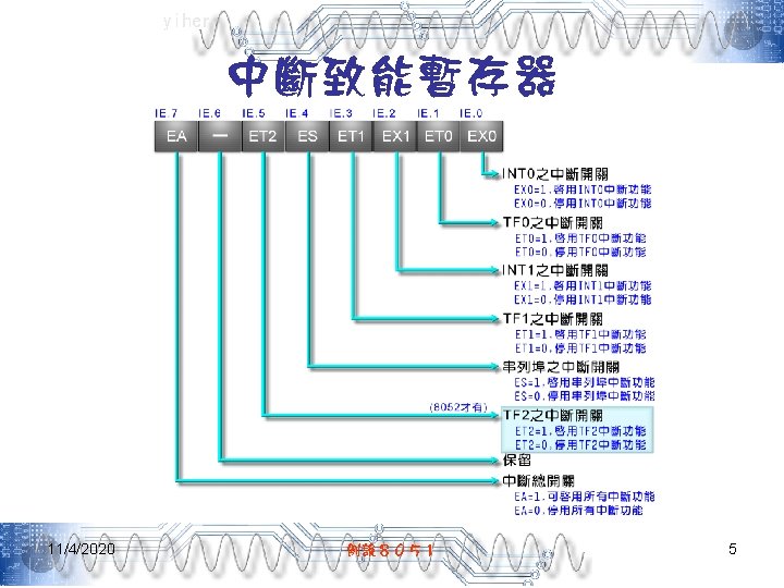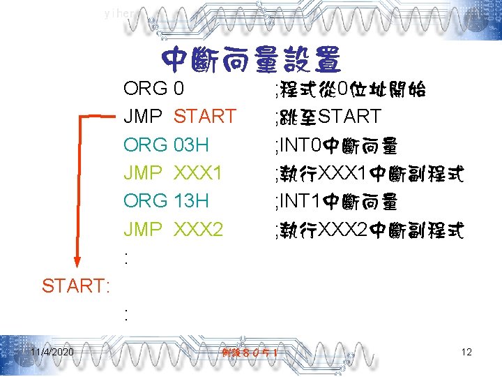 yiher 中斷向量 11/4/2020 中斷源 中斷向量 INT 0 03 H TF 0 0 BH INT 1 13 H TF 1 1 BH RI/TI 23 H TF 2/EXF 2 2 BH 例說8051 11