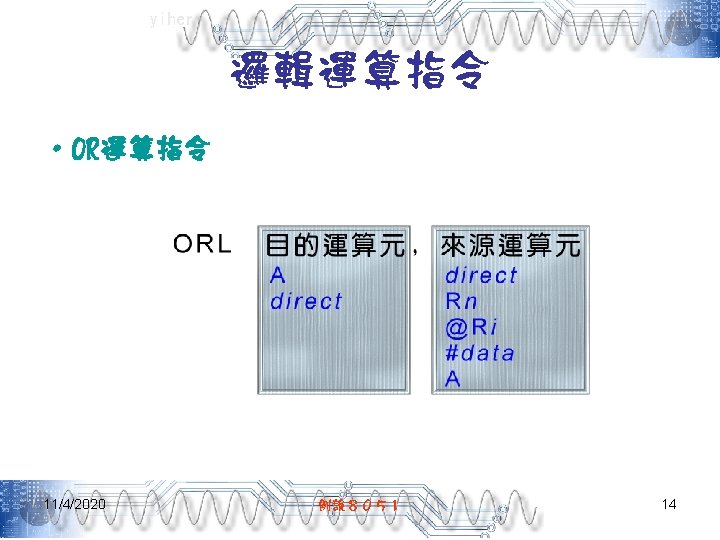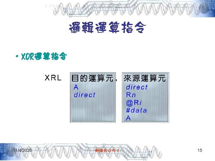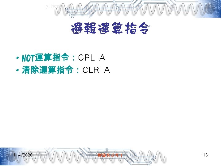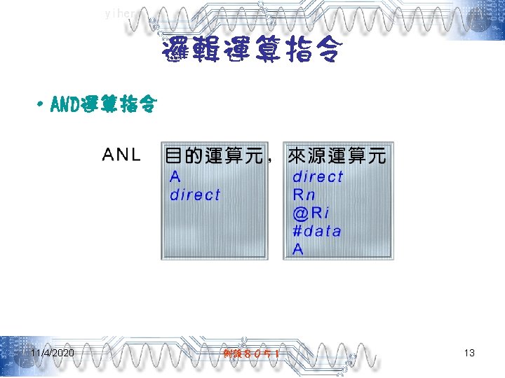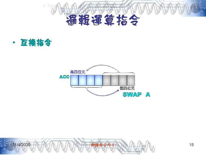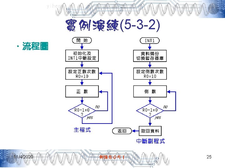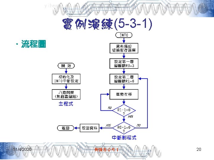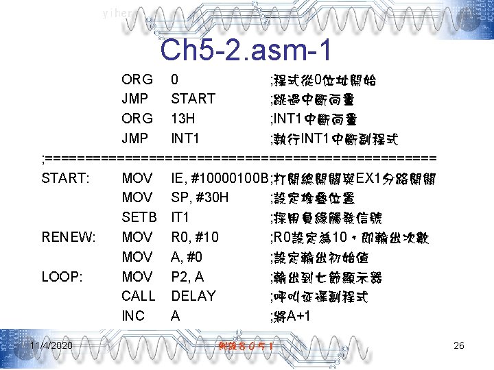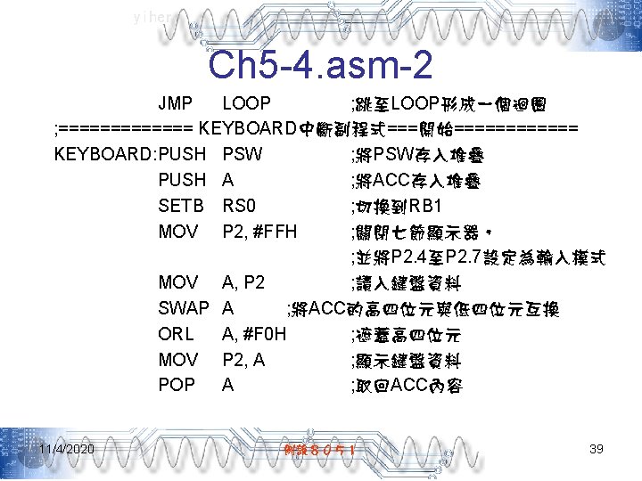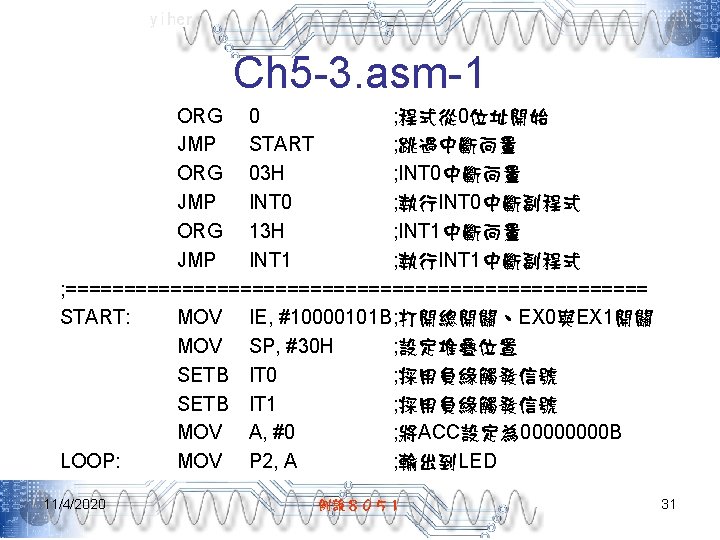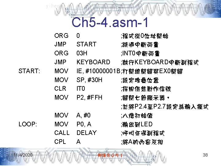 yiher Ch 5 -4. asm-3 POP PSW ; 取回PSW內容 RETI ; 返回主程式 ; =======0. 1秒DELAY副程式===開始======= DELAY: MOV R 7, #200 D 1: MOV R 6, #250 DJNZ R 6, $ DJNZ R 7, D 1 RET END 11/4/2020 例說8051 40