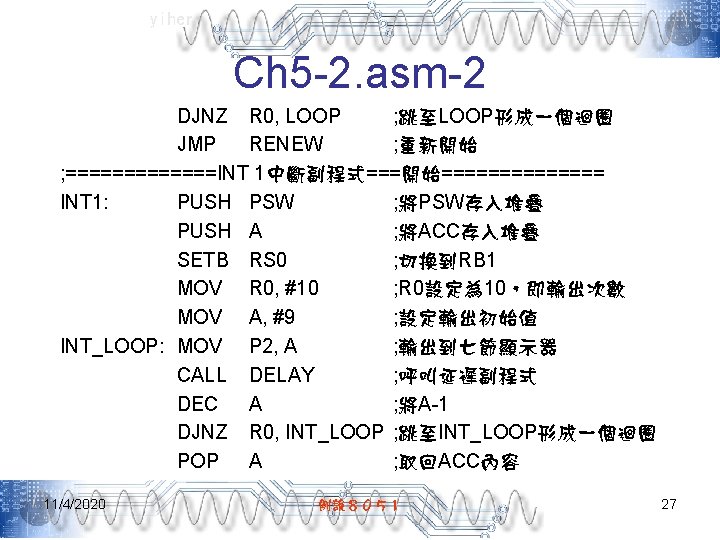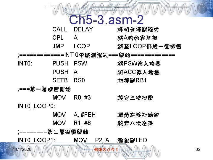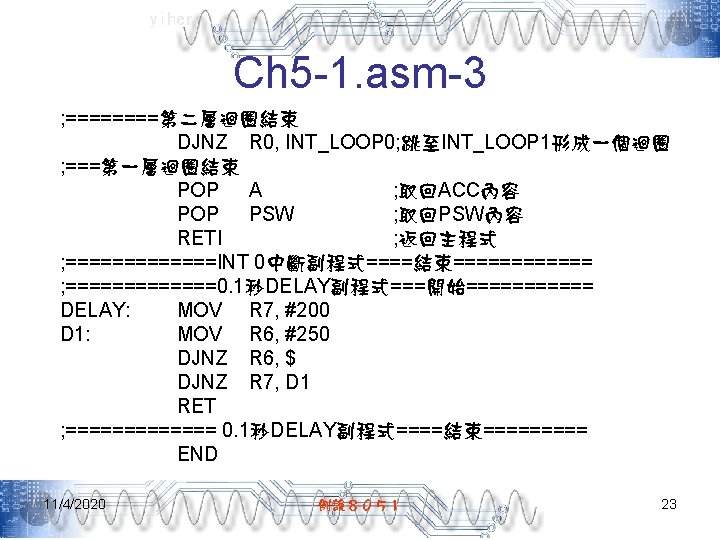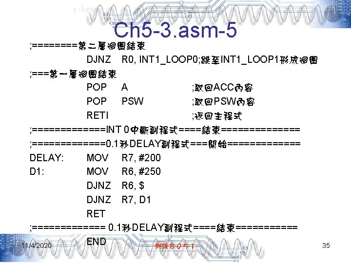 yiher Ch 5 -2. asm-3 POP PSW ; 取回PSW內容 RETI ; 返回主程式 ; =======INT 0中斷副程式====結束====== ; =======0. 5秒DELAY副程式===開始====== DELAY: MOV R 7, #5 D 1: MOV R 6, #200 D 2: MOV R 5, #250 DJNZ R 5, $ DJNZ R 6, D 2 DJNZ R 7, D 1 RET ; ======= 0. 5秒DELAY副程式====結束===== END 11/4/2020 例說8051 28