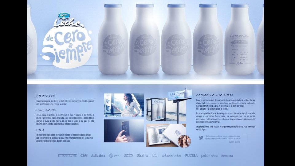 En todas las góndolas de leche Alpina del país colocamos el nuevo producto. Lo que nadie esperaba era encontrarse frascos vacíos con indicaciones para que las mamás aprendieran a modificar sus neveras con la temperatura correcta para mantener su leche materna con todas las propiedades. Así, podrían llenar esos envases y refrigerarlos para darles a sus hijos, leche de calidad.