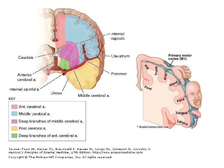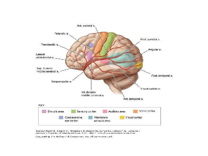 Middle Cerebral Artery • The proximal MCA (M 1 segment) supplies the following: – Putamen – Outer globus pallidus – Posterior limb of the internal capsule – Corona radiata – Most of the caudate nucleus • In the sylvian fissure, the MCA divides into the superior and inferior divisions (M 2 branches) – Inferior division supplies • Inferior parietal and temporal cortex – Superior division supplies • Frontal and superior parietal cortex