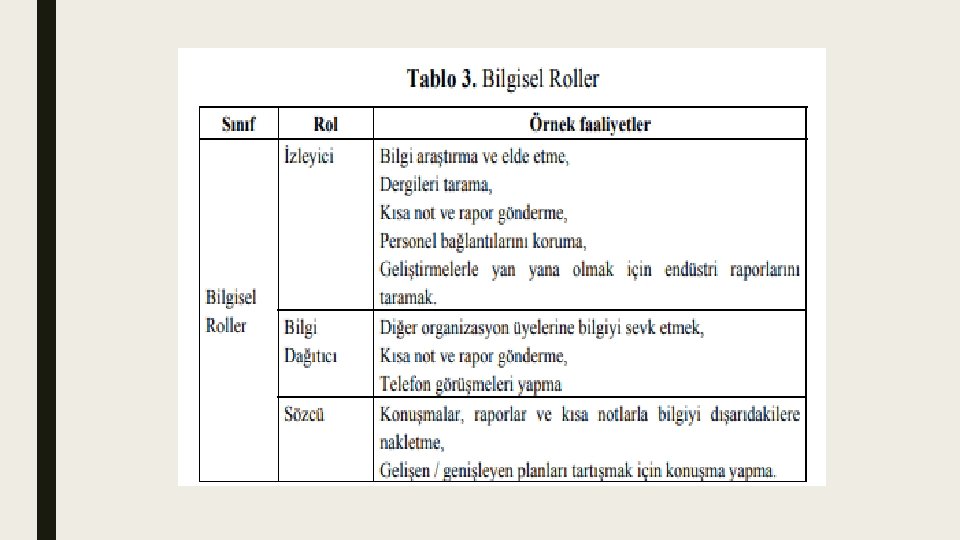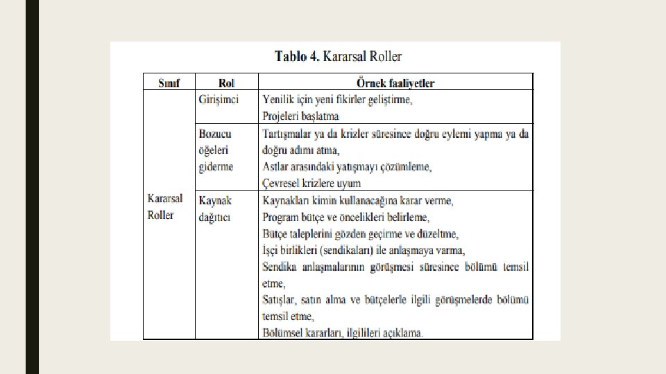 Yöneticinin Rol ve Görevleri ■ Yöneticiler, kendi işlerine, organizasyonlarına ve bireysel yeteneklerine bağlı olarak geniş bir alanda görev yaparlar. Yönetici bu görevleri yerine getirmek için, karar veren, planlayan, organize eden, liderlik ve motive eden, değişim temsilcisi, izleyici ve kontrolör, sınır belirleyici, bilgi yöntemcisi ve girişimci olmalıdır