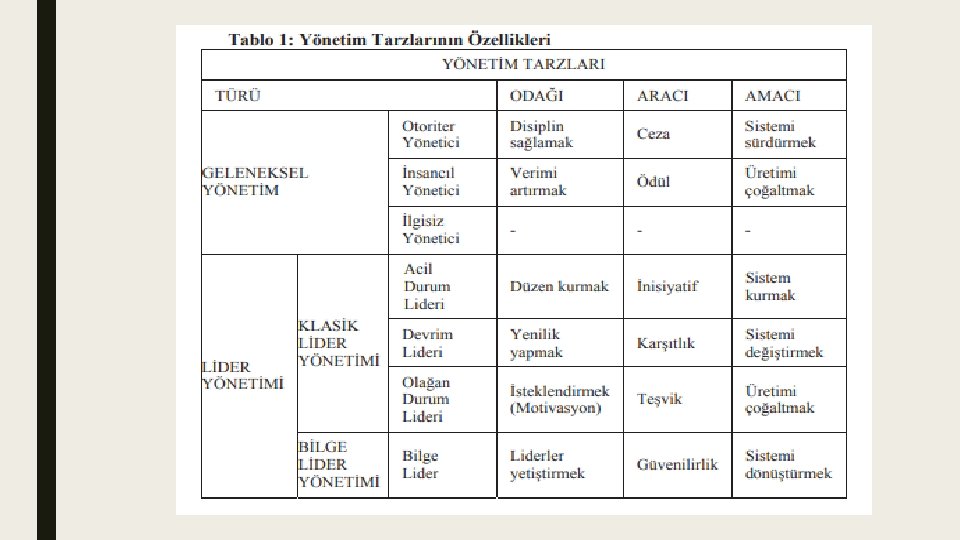 YÖNETİM TARZLARI ■ Yönetim tarzlarını geleneksel yönetim ve lider yönetimi olarak ikiye ayırabiliriz. ■ Geleneksel yöneticiler otoriter, demokratik ve insancıl; liderler de otokratik, demokratik, bürokratik, karizmatik, durumsal, etkileşimci, organizasyonel, müteşebbis ve doğal lider gibi birçok türe ayrılabilmektedir. Yönetim tarzlarını yöneticinin odağı, aracı ve amacına göre alt bölümlere ayırmak mümkündür