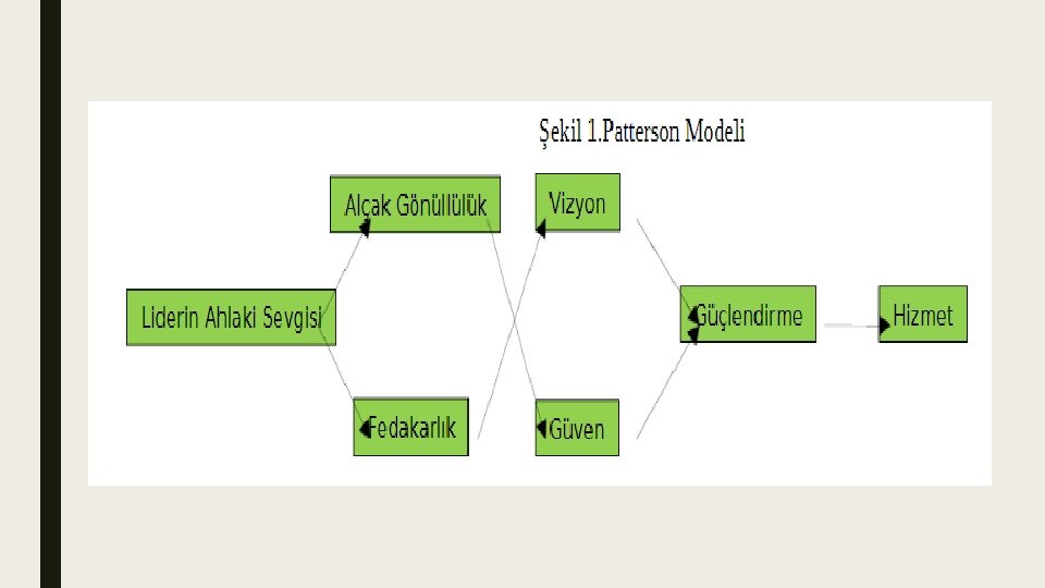 HİZMETK R LİDERLİK ■ Hizmetkâr liderlik yaklaşımında temel faktör hizmettir. ■ Bu durum liderlik etme duygusuyla yola çıkan kişilerin durumundan farklıdır. Böylece hizmetkâr liderliğin en temel farkı, önce hizmet sonra liderlik etme duygusunun gelişmesinde saklıdır. ■ Buna göre hizmetkâr liderlikte lider, çalışanlara hizmet eden, aldıklarından daha fazla veren ve kendi ihtiyaçlarından daha çok çalışanların ihtiyaçlarına önem veren kişidir.