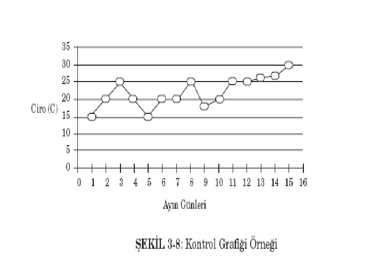 D. KONTROL GRAFİKLERİ • Kontrol grafikleri devam etmekte olan bir sürece ilişkin verilerdeki değişmeyi grafik olarak gösterir. Yatay eksende zaman birimi (dakika, saat, gün, hafta, ay, yıl) kullanılan bu grafikler özellikle meta üretim sürecinde ve finansal analizlerde kullanılmaktadır. Aşağıda 15 günlük bir süreç içerisinde bir işletmenin cirosundaki değişimini gösteren bir kontrol grafiği örneği verilmiştir.