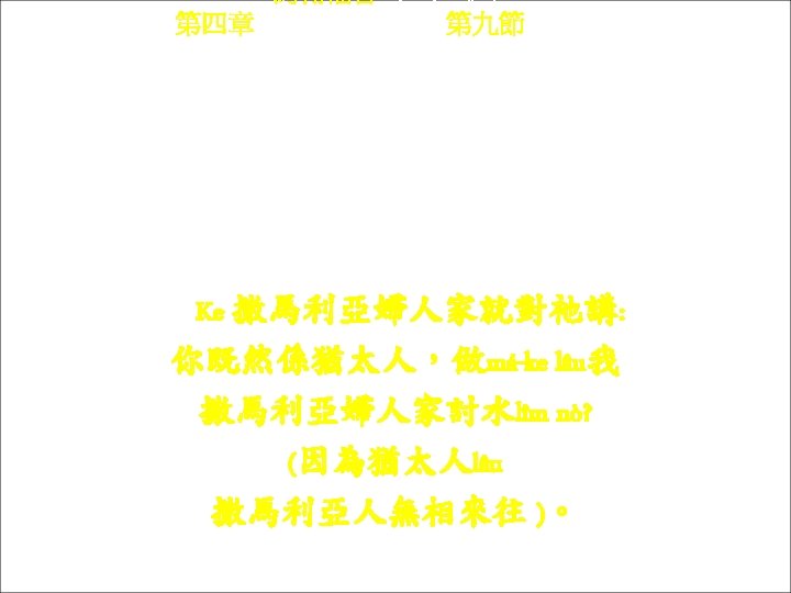 約翰福音 Yok-hon Fuk-yîm 第四章 Thi Si Chông, 第四節 Thi 4 chiet Kì yit-thin oi yù Sat-mâ-li-â kîn-ko. 祂一定oi由 撒馬利亞經過。