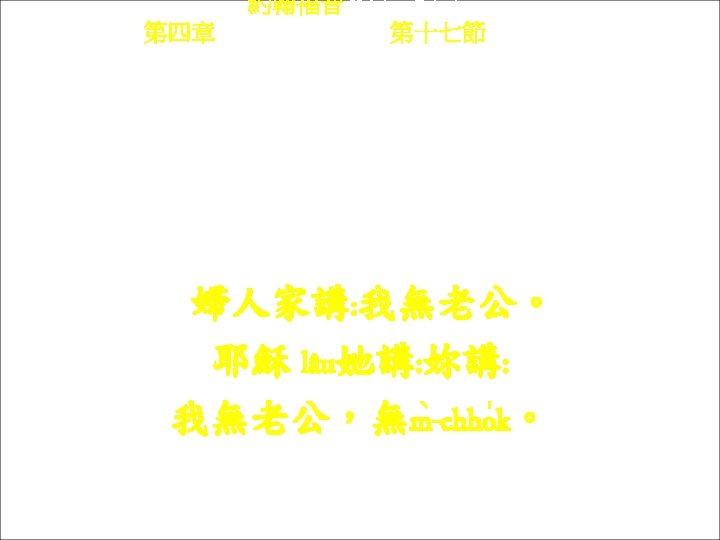 約翰福音 Yok-hon Fuk-yîm 第四章 Thi Si Chông, 第十六節 Thi 16 chiet Yâ-sû lâu kì kóng : Hi ham ngiâ ló-kûng lòi liá-vi. 耶穌lâu她講: 去ham ngiâ老公來liá位。