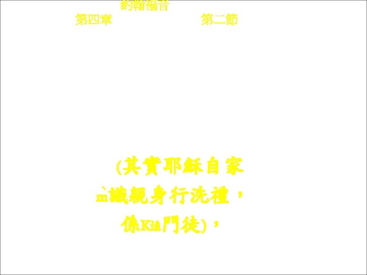 約翰福音 Yok-hon Fuk-yîm 第四章 Thi Si Chông, 第五十四節Thi 54 chiet Liá-ke he Yâ-sû chhut Yù-thai ngi p Kâ-li-li só hàng ke thi-ngi-khien sṳ n-chiak. Liá-ke係耶穌出猶太 入加利利所行ke 第二件神蹟。