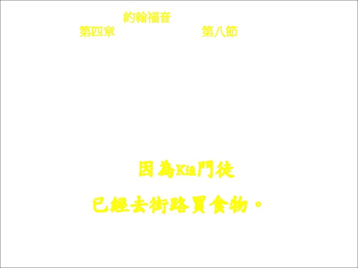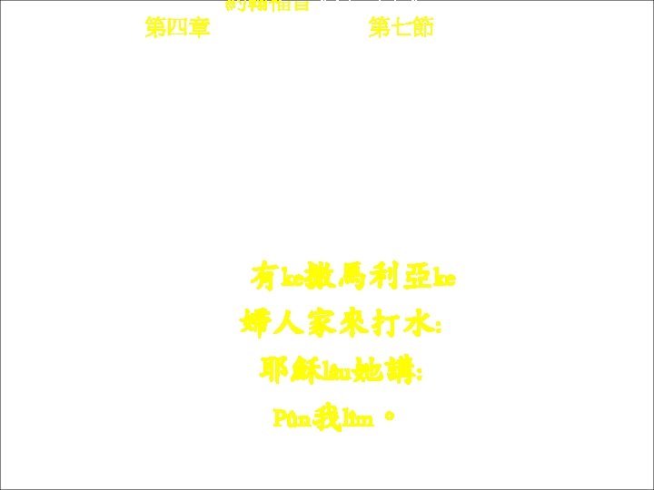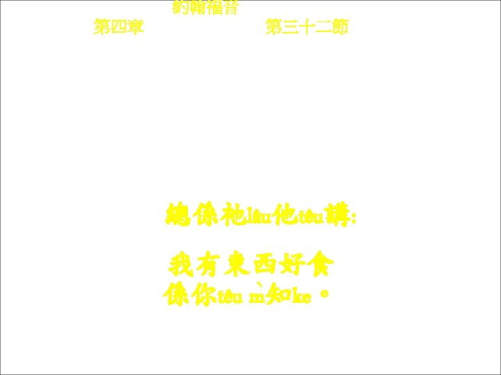 約翰福音 Yok-hon Fuk-yîm 第四章 Thi Si Chông, 第三十四節Thi 34 chiet Yâ-sû lâu kì-têu kóng : Chûn-hàng “chhâi ngài lòi ke ngìn” ke chṳ -yi lòi cho vân kì-ke kûng, chit he ngài-ke liòng. 耶穌 lâu他têu講: 遵行「差我來ke人」 ke旨意來做完他ke , 即係我ke糧。