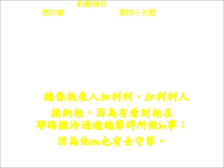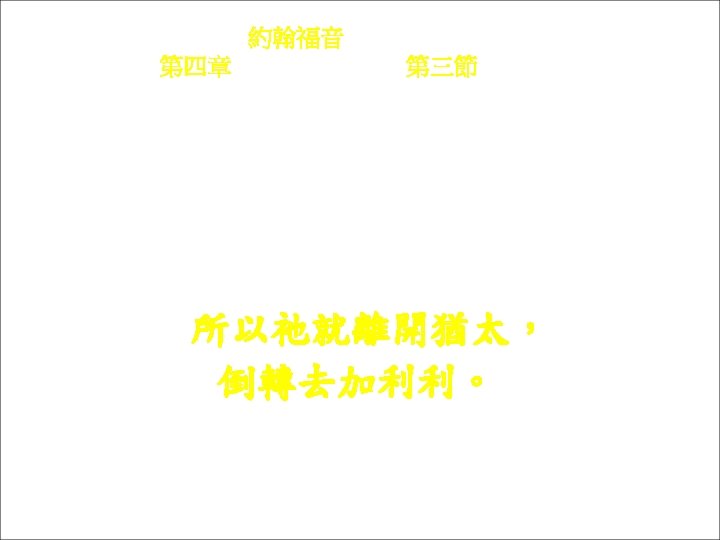 約翰福音 Yok-hon Fuk-yîm 第四章 Thi Si Chông, 第四十三節Thi 43 chiet Ke lióng ngi t ko-heu, Yâ -sû tui ke só-chhai hi to Kâ-li-li. Ke兩日過後, 耶穌tui ke所在 去到加利利。