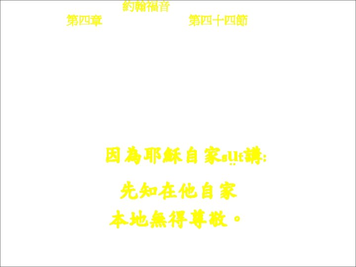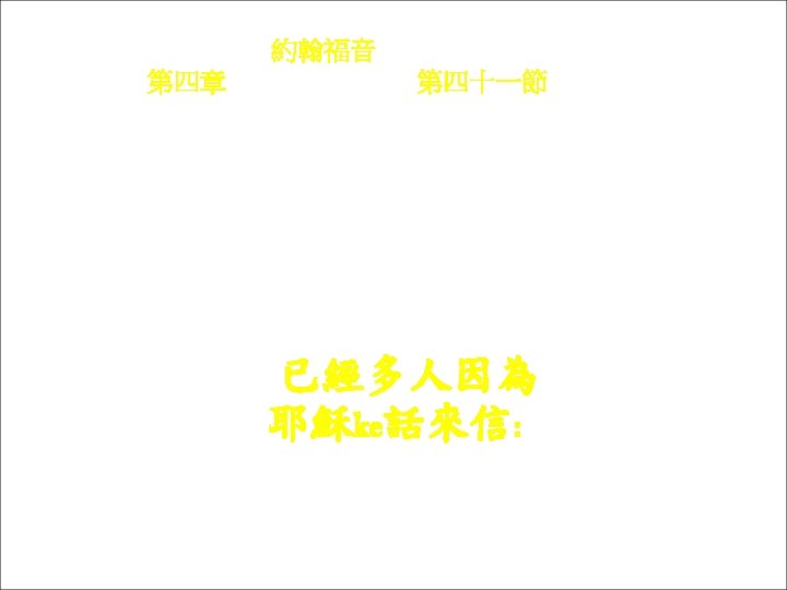 約翰福音 Yok-hon Fuk-yîm 第四章 Thi Si Chông, 第四十八節Thi 48 chiet Chúng-he Yâ-sû lâu kì kóng : na m he khon-tó sṳ n-chiak khì-sṳ, ngì-têu tu m sin. 總係耶穌lâu他講: 若m 係看到神蹟 奇事,你têu tu m 信。
