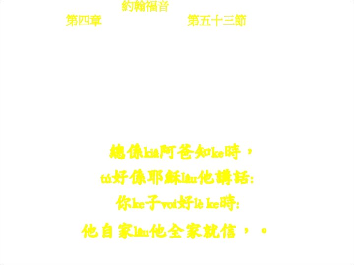 約翰福音 Yok-hon Fuk-yîm 第四章 Thi Si Chông, 第五十一節Thi 51 chiet Chhai lu-song, kiâ phu k-ngìn tù-tó kì, kóng, kì-ke chṳ hó lè. 在路上, 他ke僕人tú-tó他,講, 他ke子好lè。