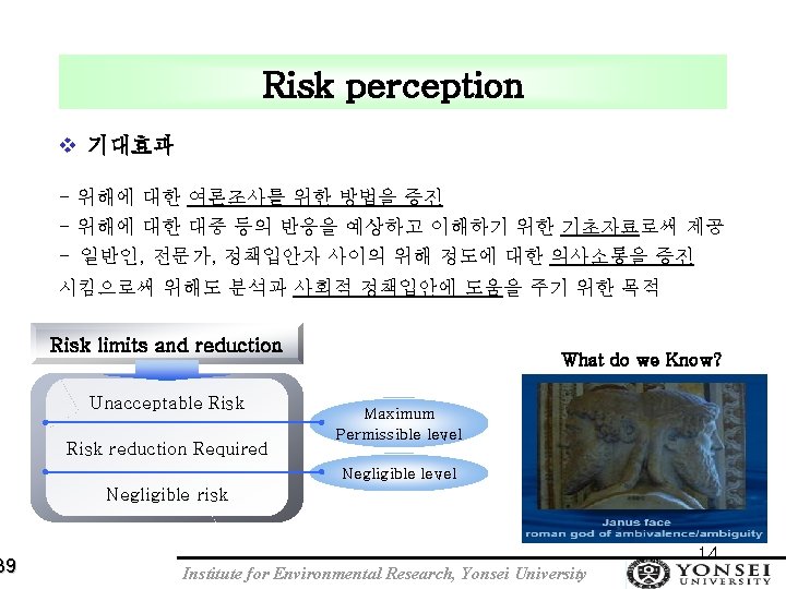 39 Risk perception v 위해인식의 영향요인 - 자발성(voluntaries), - 공포감(dread) Legislative/ Political factors Research dfaasdffasf Regulatory decisions - 지식(knowledge), - 위해 통제가능성(controllability) - 사회에 제공하는 이익 정도 - 환경문제로 인한 연간 사망자수 Social factors Technical feasibility Economic factors Risk assessment Institute for Environmental Research, Yonsei University 13