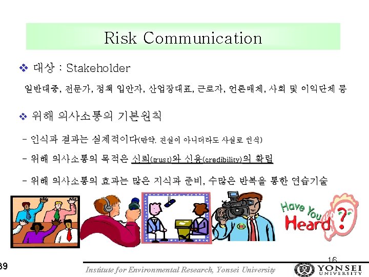 39 Risk Communication v 위해 의사소통의 정의 환경 및 건강등의 위험이나 위해에 관한 개념, 특징, 형태, 심각성 및 수용성 등 의 정보 및 관심을 각 사회 구성원들간에 상호 교환하고 공유하는 과정(interactive process) Some definitions of risk communication ; Risk communication is…………… “ any purposeful exchange of information about health or environmental risks between interested parties” (Covello et al. , 1987) “ any type of communication that informs individuals about the existence, nature, form, severity or acceptability of risk” (krimsky & plough, 1988) “ an interactive process of exchange of information and opinion among individuals, groups, and institutions; often involves multiple messages about the nature of risk or expressing concern, opinions, or reactions to risk messages or legal and institutional arrangements for risk management” (National research council, 1989) “ risk communication is the process of informing people about hazards to their environment or their health” (EPA, 2003) Institute for Environmental Research, Yonsei University 15