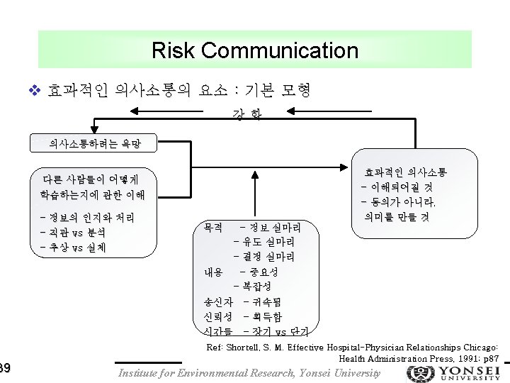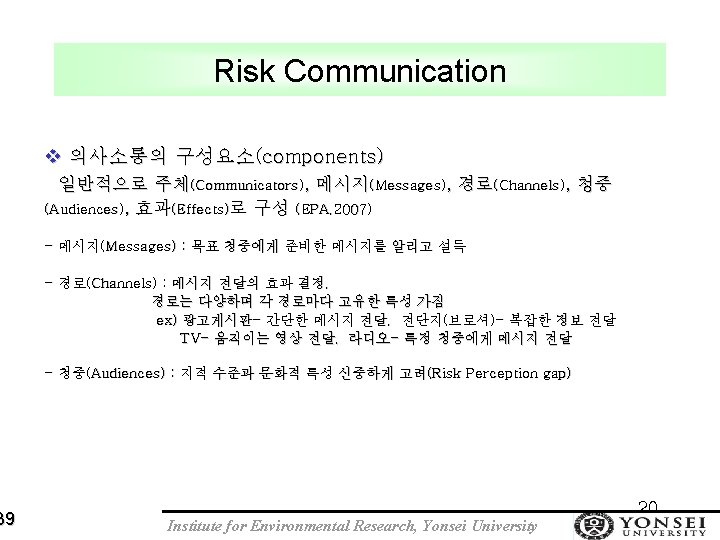 39 Risk Communication v 위해정보전달의 구성요소 v 의사소통의 기본 메커니즘 Institute for Environmental Research, Yonsei University 19