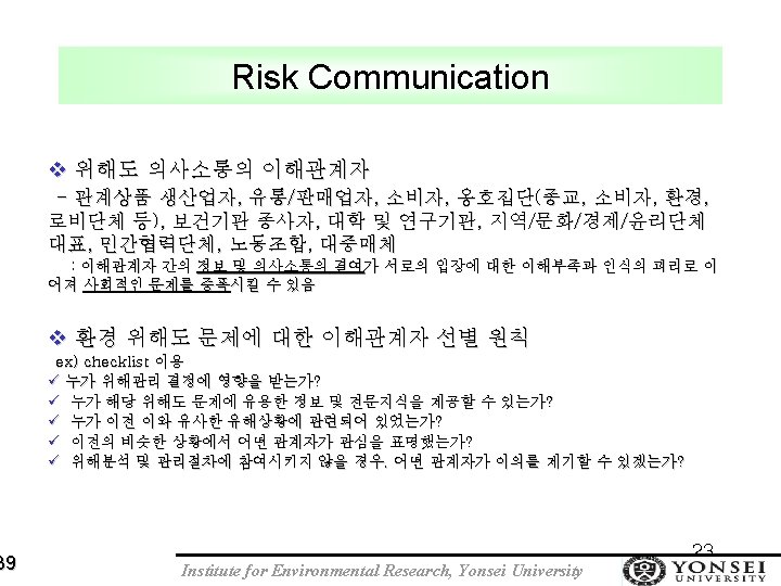 Risk Communication v Potential RC team members Leadership Communication Legal Marketing RISK COMMUNICATION TEAM Technical SMEs [small and medium-sized enterprises) Govt Relations Community Outreach/ Education Institute for Environmental Research, Yonsei University 22