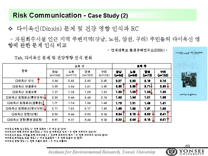 Risk Communication - Case Study (1) v POPs(Persistent Organic Pollutants: 잔류성유기화합물질)/황사의 위해 인식에 대한 RC 프로그램의 효과분석 - 2 - 연세대학교 환경공해연구소(2003) Fig. 매체 특성에 따른 환경 상태의 관심도 Fig. 프로그램 실시 전/후의 POPs 및 황사의 인지 변화 Trust Gap Knowledge Gap 47 Institute for Environmental Research, Yonsei University 47