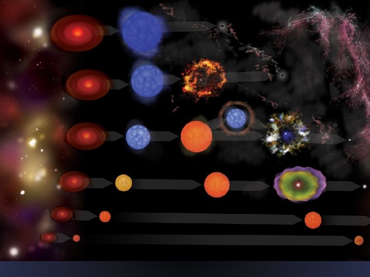 *Lifespan ~109 years. *Above ~2 msun, stars are large enough that their cores heat up enough to fuse carbon, oxygen, neon, and silicon into heavier and heavier atoms. *All these reactions are exothermic – they release heat – so the core just gets hotter and hotter. *