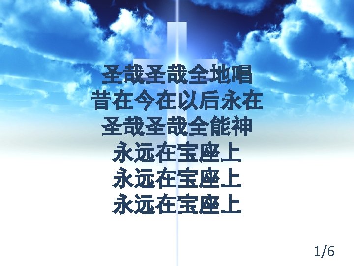 圣哉圣哉全地唱 Holy, holy, all nations sing 昔在今在以后永在 Everlasting, the King of kings 圣哉圣哉全能神 Holy, holy, Almighty God 永远在宝座上 forever on the throne 1/6
