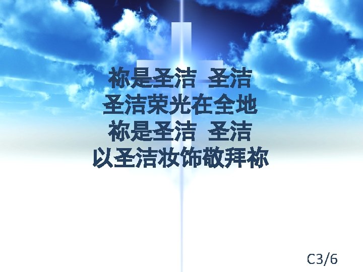 祢是圣洁 圣洁 You are Holy, holy 圣洁荣光在全地 The earth is filled with Your glory 祢是圣洁 圣洁 You are Holy, holy 以圣洁妆饰敬拜祢 In Your holiness, we worship C 6/6