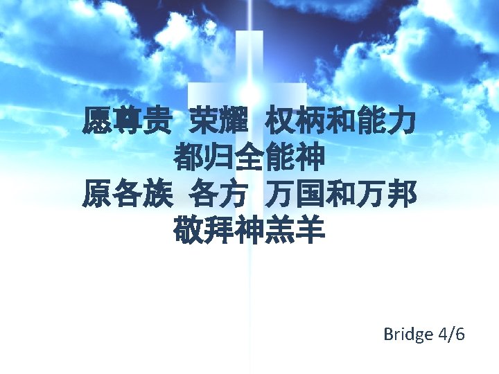 愿尊贵 荣耀 权柄和能力 All glory, honor, majesty, and power 都归全能神 Be to You alone 原各族 各方 万国和万邦 All people, nations, and all creation 敬拜神羔羊 Worship You alone Bridge 4/6