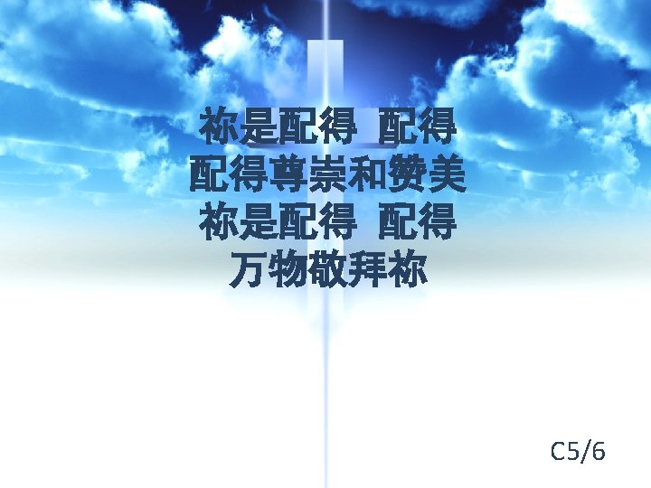 祢是配得 配得 You are Worthy, worthy 配得尊崇和赞美 Worthy of the power and praise 祢是配得 配得 You are Worthy, worthy 万物敬拜祢 Lord, we worship You C 2/6