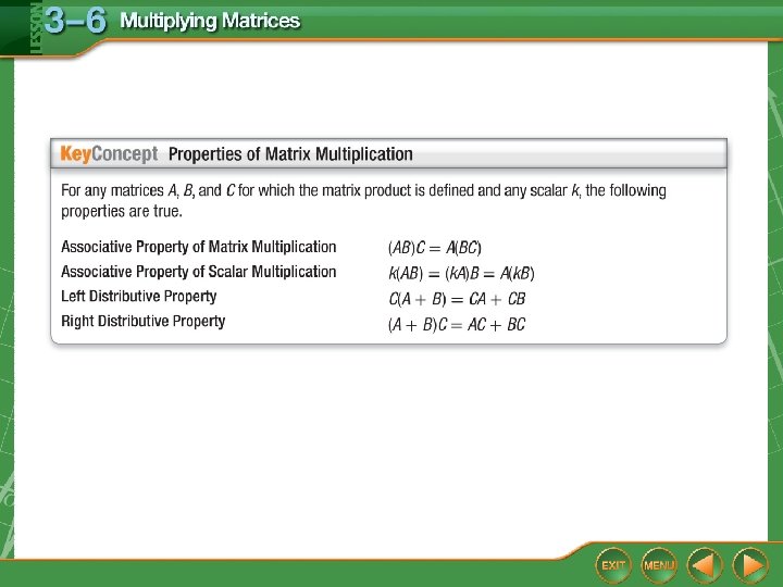 You multiplied matrices by a scalar. • Multiply matrices. • Use the properties of matrix multiplication.