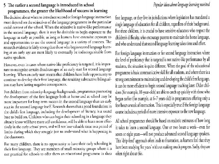 Is younger better? • Learners are never to young to be introduced and surrounded by English v Books v T. V. v Music v Games v English Toys • Learners can be too young to study it