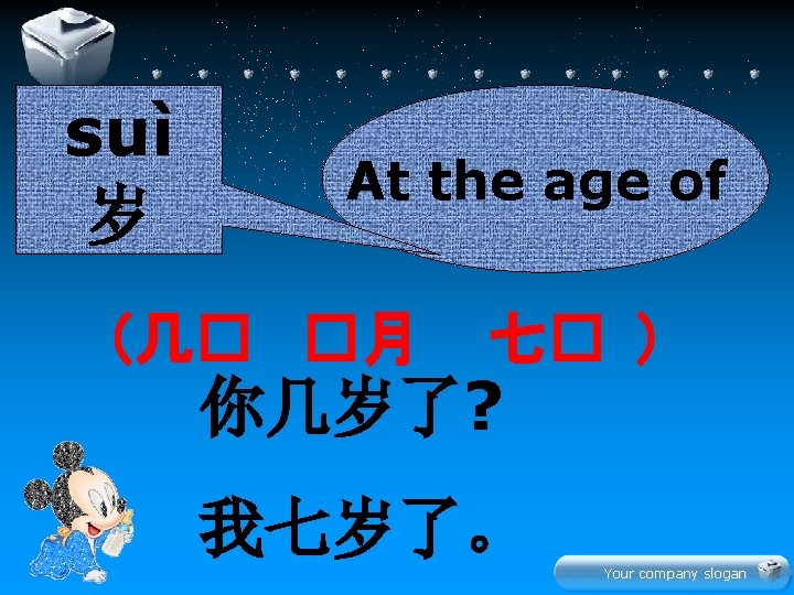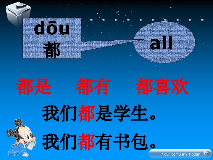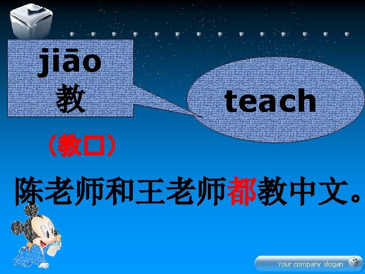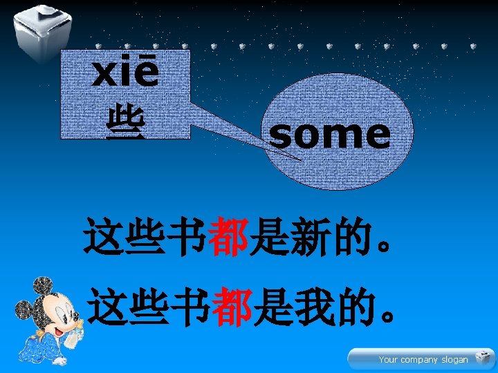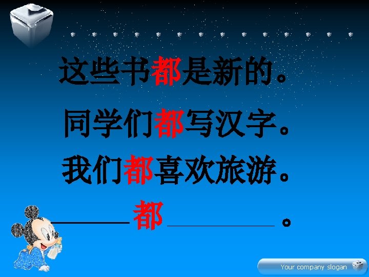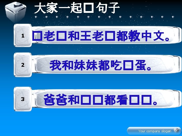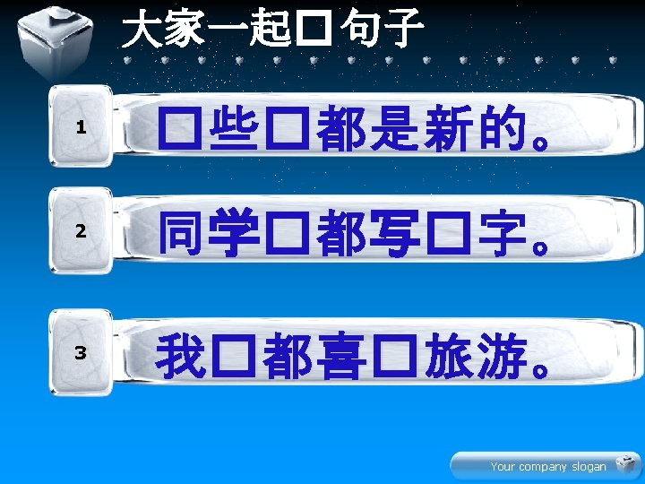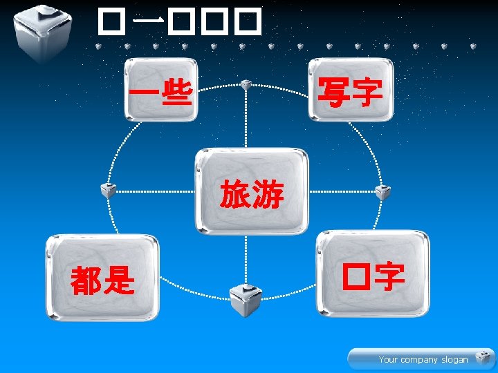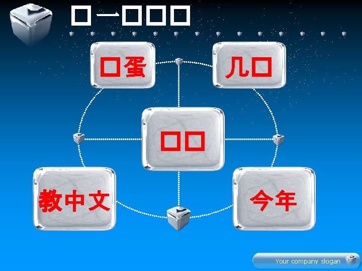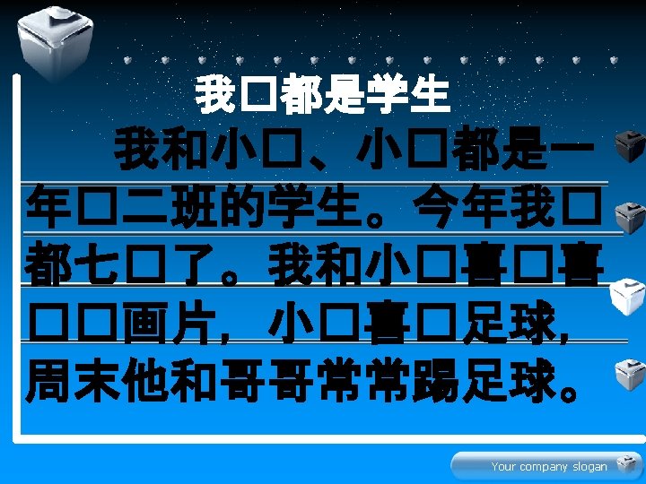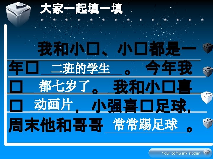 Your company slogan Hn z xi Your company Slides: 22 Download presentation 生 � 学 Your company slogan Hàn zì 汉字 xiě 写 写汉字 Your company slogan lǚ yóu 旅游 tourism 我们都喜欢旅游。 Your company slogan jī dàn 鸡蛋 我和妹妹都吃鸡蛋。 Your company slogan diàn shì 电 视 爸爸和妈妈都看电视。 Your company slogan jin nia 今 年 this year 今年你几岁了? 今年我七岁了。 Your company slogan 学 � 文 Your company slogan 水果 衣服 Your company slogan 辛苦大家了! � 啦 再 Your company slogan