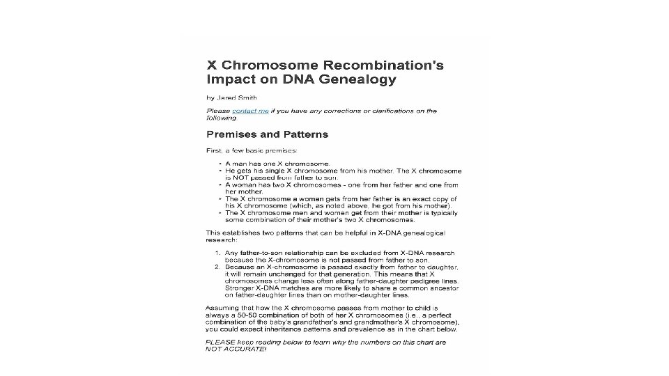 The X and Y Chromosome and how your gender effects your DNA. Read the following article: X Chromosome Recombination’s. Impact on Genealogy. If you are female, who do you get your genes from? Who can’t you get your genes from? Same, if you are male, who do you get your genes from? Who can’t you get your genes from? Use the picture charts from the article to see if you can figure out your X chromosome impact on your genealogy. How would this help law enforcement find the suspect using XY chromosome DNA genealogy?