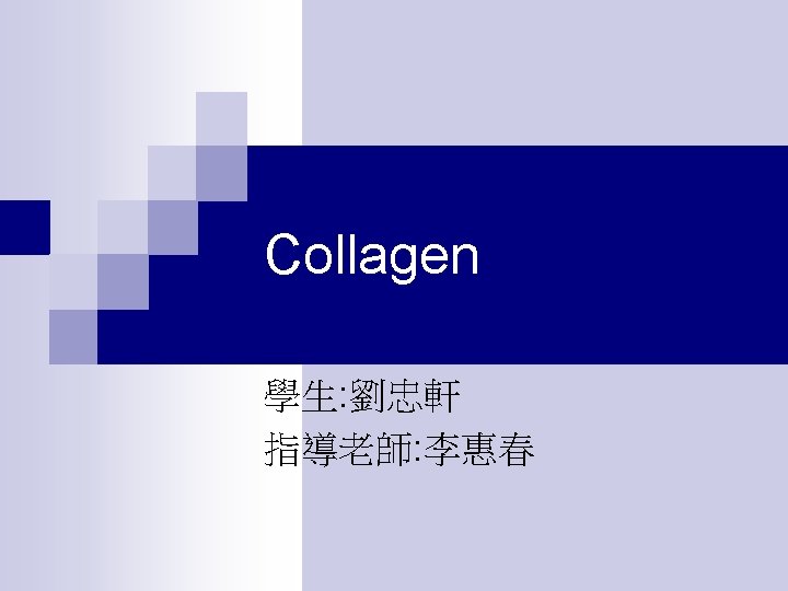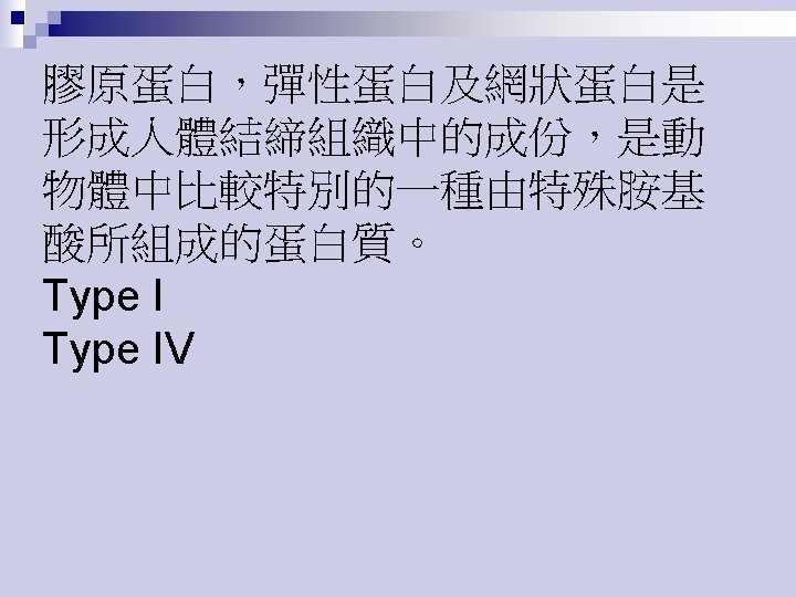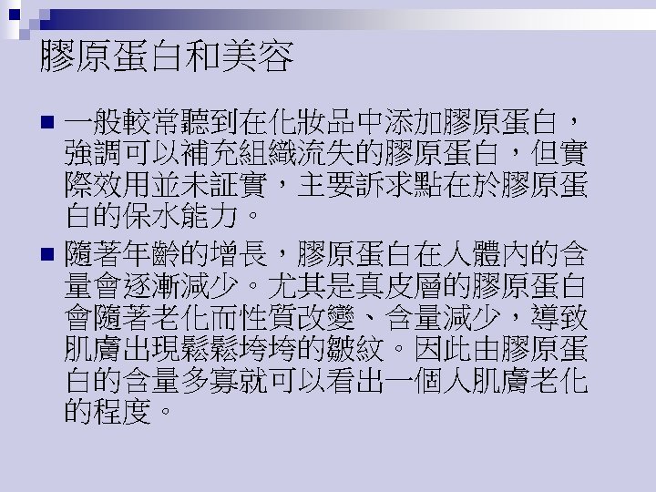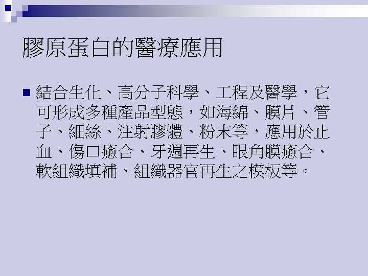Your Most Plentiful Protein 人體 1/4 Protein 是 Collagen: n Tendons 、resilient sheets 、Bones、 n Teeth ‧‧‧ n
