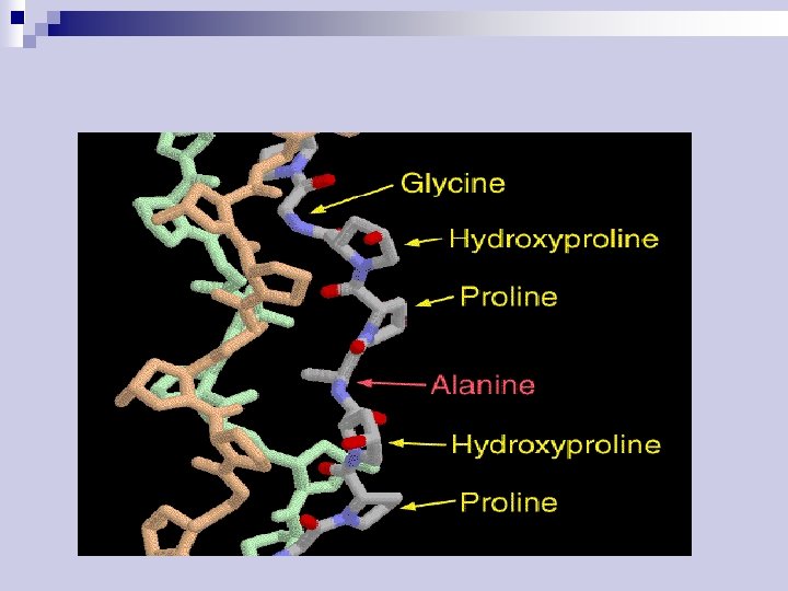 The Collagen Triple Helix Collagen is composed of three chains, wound together in a tight triple helix. n A repeated sequence of three amino acids forms this structure. n Every third amino acid is glycine、proline、 hydroxyproline n