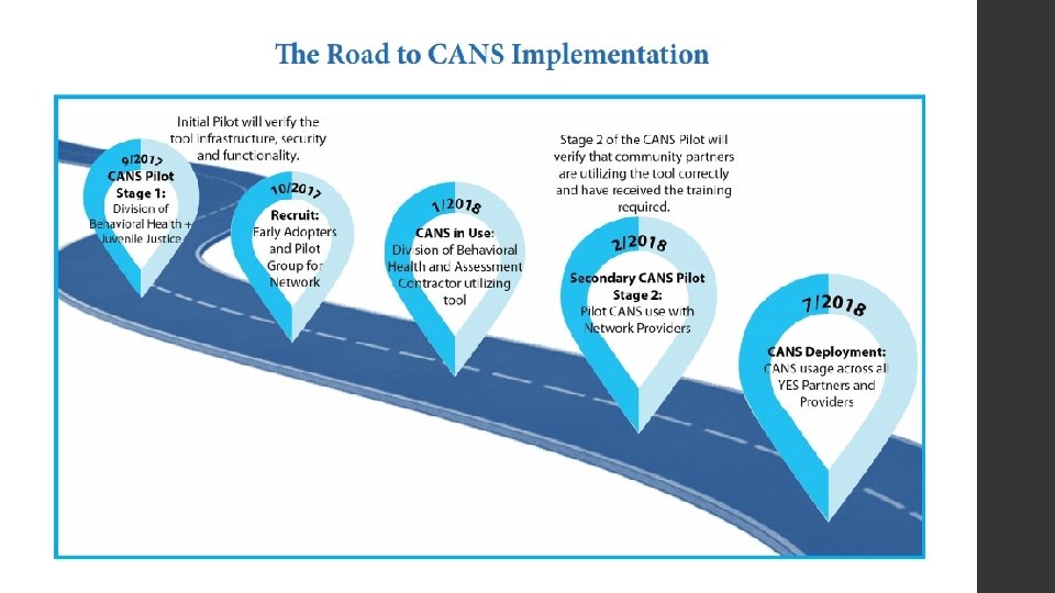 Ø CANS • The Child and Adolescent Needs and Strengths (CANS) tools is Idaho’s new assessment strategy for the Youth Empowerment Services (YES) system of care. It replaces the CAFAS, PECFAS, and CALOCUS. • CANS tools: Checklist: A self rated tool developed by the State Department of Education that will be used state-wide by anyone to identify and refer children for potential membership to YES. CANS Screener: A CANS based screening designed for medical providers. It will assist medical providers in determining if a child should be referred for YES. CANS 50: A shortened version of the CANS that will be used exclusively by the Independent Assessor to determine Class Membership. CMH CANS: Certification required; assists in PCP; can be shared with YES partners, given family permission; completed every 90 days