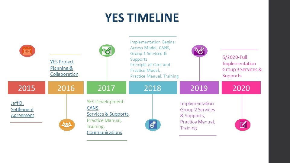 What is Youth Empowerment Services? • Background: settlement agreement for the Jeff D Lawsuit • Youth Empowerment Services (YES) is a new system of care that is being developed for Idaho children and youth with serious emotional disturbance (SED). It will provide: Improved access to services: Multiple ways to start services, more access to Medicaid, better information about services offered Improved choice of services: New services and supports available, more providers trained to provide services Improved quality of services: Collaborative, strengths-based, family-based, community-based • This new system of care will be rolled out in phases between 1/2018 and 5/2020.