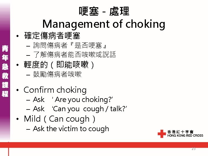 哽塞 - 徵狀 Symptoms of choking • • • 咳嗽,不管是劇烈還是微弱 單手或雙手緊握/抓著喉部 不能咳嗽、說話、大叫或是呼吸 驚慌 皮膚發紺(紫藍色) 如果不清除阻塞物會失去知覺,人事不省 Coughing, maybe loudly or weakly Clutching the throat with one / both hands Cannot cough, speaking, shout or breath Panic Cyanosis (bluish skin colour) May become unconscious if foreign body not be removed 22