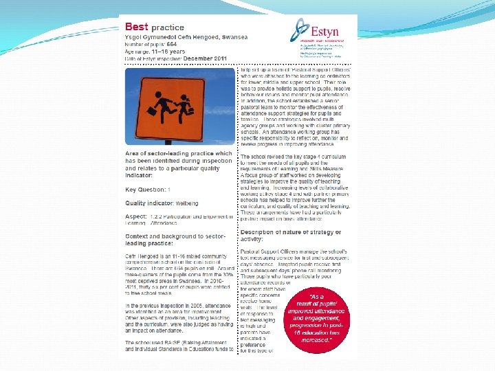 Along the Improvement Journey Estyn inspection report December 2011 Standards Good Key Question 1 Outcomes Good Prospects for Improvement Excellent Key Question 2 Provision Excellent Key Question 3 Leadership Excellent Aspects Judged Good Aspects Judged Excellent Standards Teaching Resource Management Wellbeing Learning Experiences Care, support and guidance Learning environment Leadership Partnership Working Improving Quality Sector Leading Practice Best Practice Reports • A holistic approach to improving attendance • Developing a skills programme for all pupils