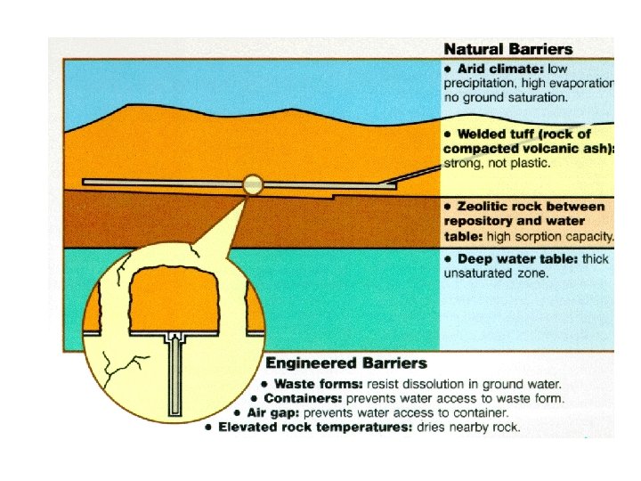 Advantages of deep geologic disposal • If properly chosen, host-rock should be able to absorb radiation and dissipate heat. • Accidental or malicious intrusion can be prevented by depth below the surface. • Migration of radionuclides can be minimized by construction of multiple barriers. • Underground repositories require minimal to no maintenance. • Flexibility of rock types available. • Construction of repositories is feasible from an engineering viewpoint. • Waste can be retrievable if necessary.