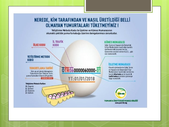 Üzerinde, "Yetiştirme metodu kodu" olan bu kod bulunmayan yumurtalar satılmayacak. Bakanlığın tebliğine göre eski yumurtalar üzerindeki kodlamada TR diye başlayan ardından ilin plaka kodu ve ondan sonra kümes işletme numarası vardı. Şimdi ise bunların önüne 4 farklı yumurta üretim metodu kodu geldi. Yeni tebliğe göre, yumurtalar üzerindeki kod, 0, 1, 2 ve 3 numarası ile başlayacaktır.