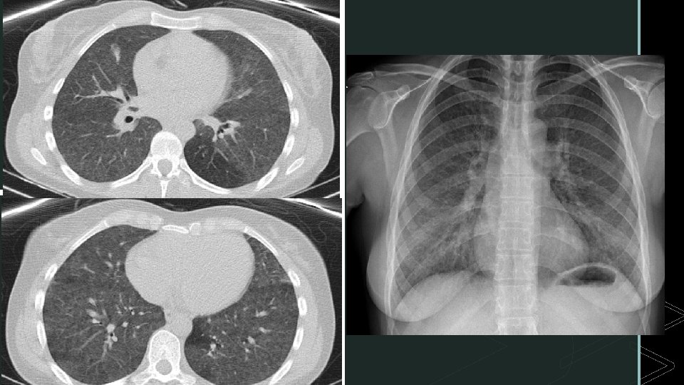 Pruebas complementarias: • Analítica: destaca: PCR 4, 84 mg/d. L [<0, 5], Linfocitos 9, 20% [37 -70%] • Gasometría arterial: normal: p. H 7, 40, p. CO 2 32, p. O 2 64, bicarbonato 24, sat. O 2 94%. • PCR en aspirado nasofaríngeo para Influenza y pruebas microbiológicas: negativo. PCR en LBA para neumocystis negativa. Quantiferon-TBC negativo. • PFR: DLCO muestra una disminución severa de la difusión. • Precipitinas alteradas para pájaros (Ig. G ESPECÍFICAS) • LBA linfocitosis y cociente CD 4/CD 8 invertido (<1). La Rx y el TACAR muestran la siguiente imagen