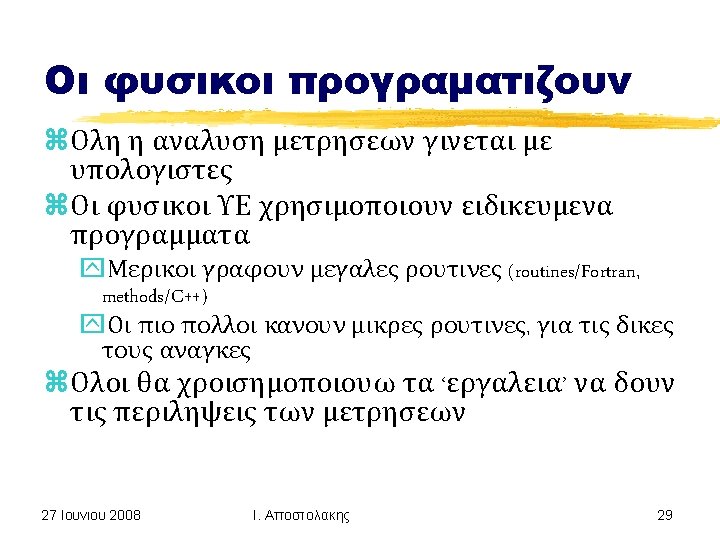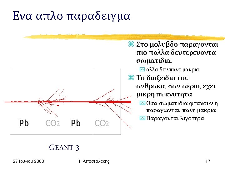 GEANT 4 z Detector simulation tool-kit for HEP yoffers alternatives, allows for tailoring z Software Engineering and OO technology yprovide the method for building, maintaining it. z Requirements from: y. LHC yheavy ions, CP violation, cosmic rays ymedical and space science applications z World-wide collaboration 27 Ιουνιου 2008 Ι. Αποστολακης 56