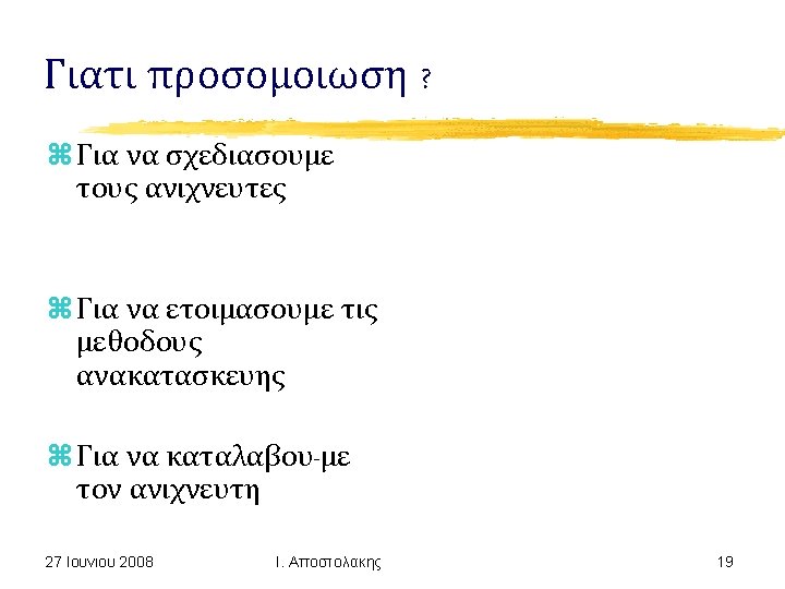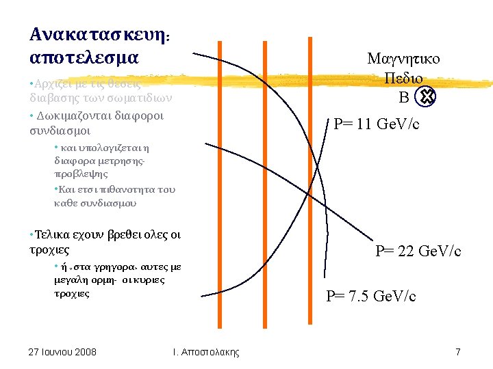 One area: Tracking z. What a simulation code needs to do for each step of particle: y. Determine the step length x. Corresponding to the applicable physics processes x. Checking if it crosses a geometrical boundary y. Model the final state of the track, x. Advancing it, potentially in an EM field, x. Applying the actions of the physics processes, • which can create secondary particles. y. Deposit energy in current position (‘hit’). 27 Ιουνιου 2008 Ι. Αποστολακης 52