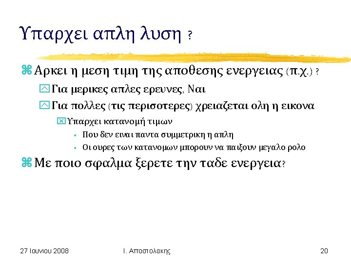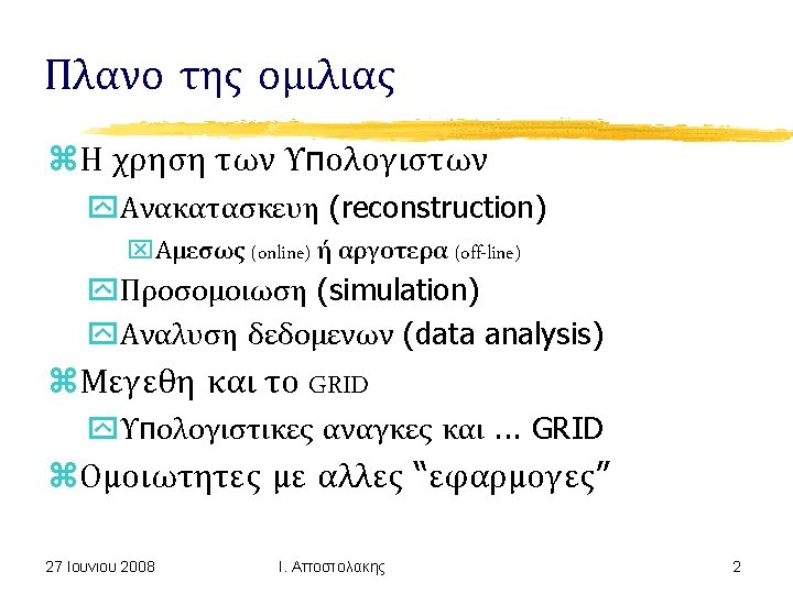 Simulation ‘packages’ z Provides the means to simulate ythe physical processes and ydetector response of an experiment. z As was realised by many in the past, ymost of the parts needed can be common between experiments (eg physics, geometry blocks). z So it makes eminent sense to create and use a general purpose package y. That includes the common parts, y. And enables an experiment to describe those parts with are specific to it. 27 Ιουνιου 2008 Ι. Αποστολακης 41