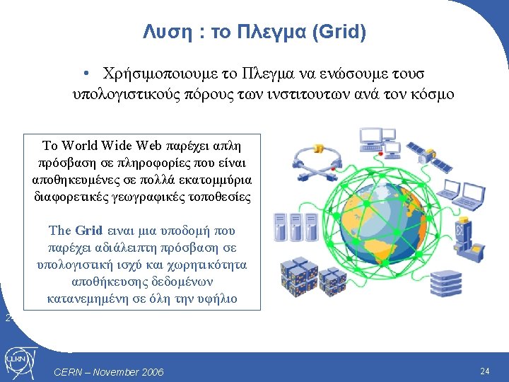 LCG § The Worldwide LHC Computing Grid The LHC physics data analysis service distributed across the world § CERN, 11 large Tier-1 centres, ~ 140 active Tier-2 centres § Status in May 2007 § Established the 10 Gigabit/sec optical network that interlinks CERN and the Tier-1 centres § Demonstrated data distribution from CERN to the Tier-1 centres at 1. 3 GByte/sec – the rate that will be needed in 2008 § ATLAS and CMS can each transfer 1 Peta. Byte of data per month between their computing centres § Running ~2 million jobs each month across the grid § The distributed grid operation, set up during 2005, has reached maturity, with responsibility shared across 7 sites in Europe, the US and Asia § End-user analysis tools enabling “real physicists” to profit from this worldwide data-intensive computing environment last update 12/06/2021