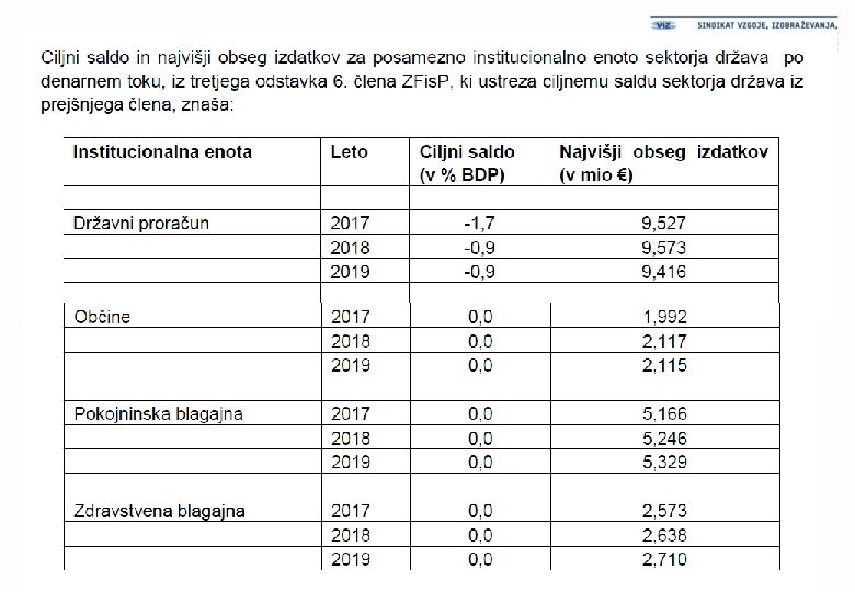 Zadnji sindikalni predlog: z dne 25. 4. 2016 V letu 2017: – Od 1. 1. 2017 dalje regres za letni dopust v višini minimalne plače. – Napredovanja v plačne razrede in nazive se v letu 2017 izvedejo, izplačilo s 1. 7. 2017. – KDPZ od 1. 1. 2017 v višini 30 %, od 1. 12. 2017 v višini 60%. – Redna delovna uspešnost za leto 2017 = 1% letnih sredstev za osnovne plače. – Delovna uspešnost - povečan obseg dela + trg – v enaki višini kot v letu 2016. – Pričetek pogajanj o postopni odpravi ukrepov na področju dela v javnem sektorju, ki so se uveljavila s sprejetjem ZUJF v letu 2012. V letu 2018: - Napredovanja v plačne razrede in nazive se v letu 2018 izvedejo, izplačilo s 1. 6. 2018. - KDPZ od 1. 1. 2018 v višini 60 %, od 1. 12. 2018 v višini 90%. - Napredovanja v plačne razrede in nazive se v letu 2018 izvedejo, izplačilo s 1. 6. 2018 - Redna delovna uspešnost za leto 2017 = 1, 5% letnih sredstev za osnovne plače. - Delovna uspešnost - povečan obseg dela + trg – v enaki višini kot v letu 2016. V letu 2019: - Od 1. 1. 2019 dalje polne premije KPDZ. - Napredovanja v plačne razrede in nazive se v letu 2019 izvedejo, izplačilo s 1. 4. 2019. - Redna delovna uspešnost za leto 2019 = 2% letnih sredstev za osnovne plače.
