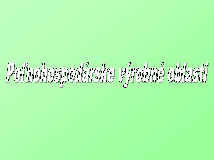 • • • a) kukuričná poľnohospodárska výrobná oblasť : má najpriaznivejšie podmienky pre rozvoj poľnohospodárstva nížiny a kotliny do 200 m. n. m. – Podunajská a Východoslovenská nížina, časti Juhoslovenskej a Košickej kotliny priemerné ročné teploty 9, 5 – 10 °C zrážky 550 – 600 mm – sú potrebné závlahy černozeme plodiny náročné na teplo a pôdu – kukurica, pšenica, cukrová repa, olejniny, tabak, vinič, ovocie